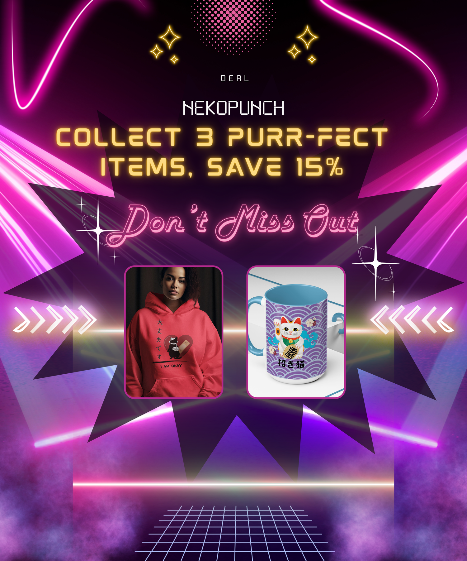 Pounce on the Purrfect Deal at NekoPunch! Buy any 3 cat-themed items and get 15% off your total. Stock up on meow-velous merch like tees, mugs, and decor while saving big. Don’t miss this paw-some op-purr-tunity – shop now and let the savings begin!